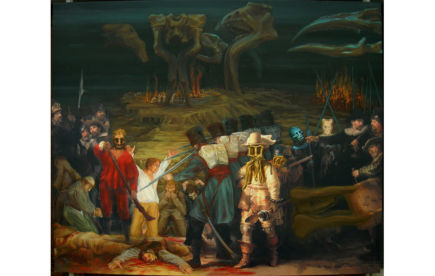 Om de onoverkomelijke en onbegrijpelijke aard van dood en oorlog vorm te geven heb ik in navolging van Goya enkele bovennatuurlijke elementen gebruikt. Bovenaan het doek, zwevend over een tafereel van inquisitie, plaatste ik vergrote fossielkoppen van prehistorische dieren; onderaan proberen maskers de anonieme en agressieve daad te verhullen; het resultaat is een geschilderde tijdverschuivede collage waarin de tegenstellingen elkaar besmeuren. Omdat de formele overeenkomsten in beide kunstwerken opvallend zijn durf ik te stellen dat de Nachtwacht de voorloper is van Goya’s “The Executions” en daarmee aansluit bij de historisch belangrijkste kunstwerken over dit thema : Picasso’s “Guernica” en Goy’s “The Executions” .