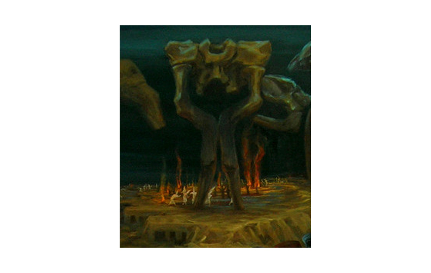 At the top of the canvas, floating over a Goya inquisitional scene, I put enlarged fossil heads of prehistoric animals; at the bottom masks attempt to veil the anonymous, aggresive deed.